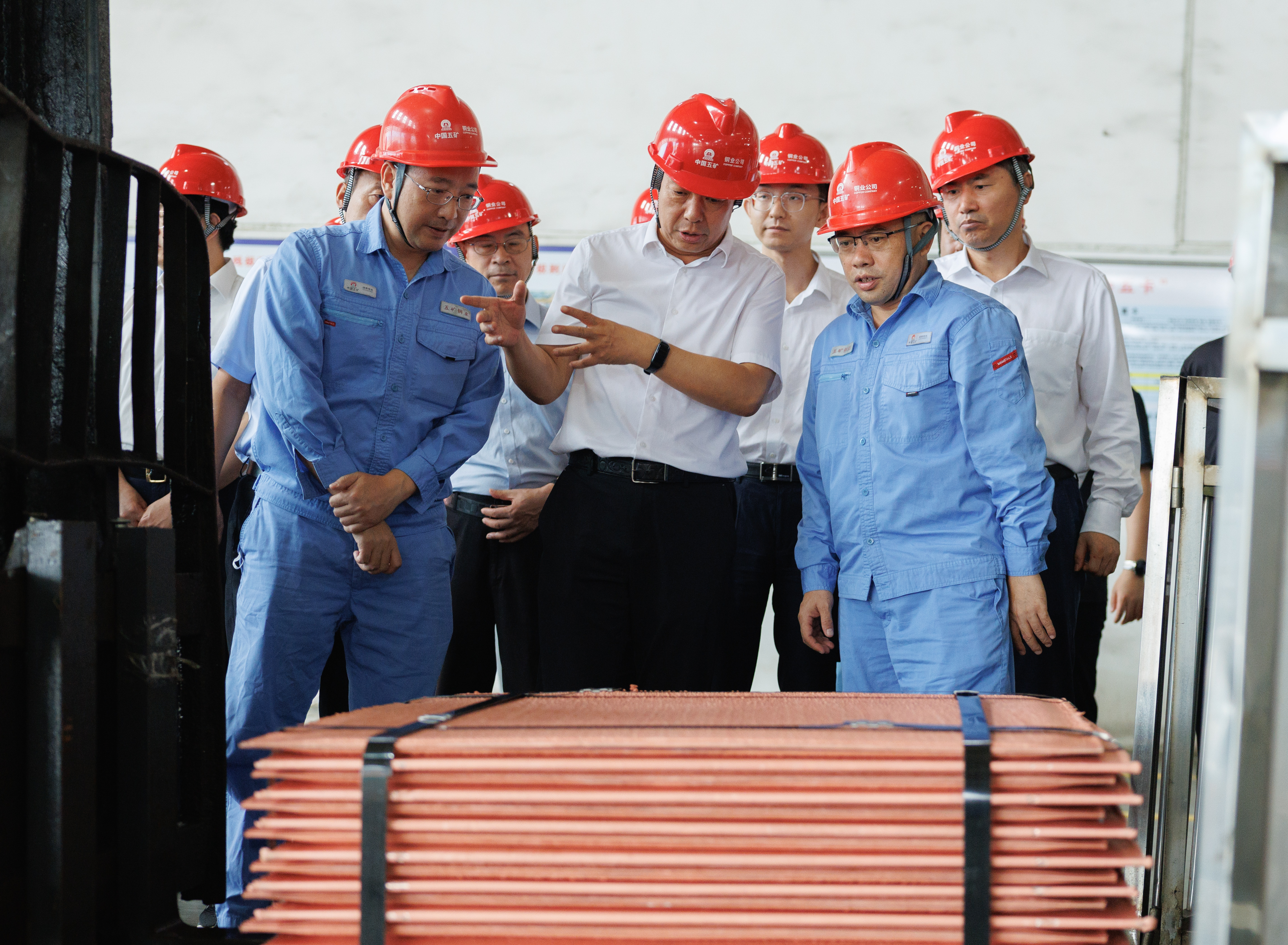 陈得信在铜业公司电解厂查看刚刚下线的产品阴极铜